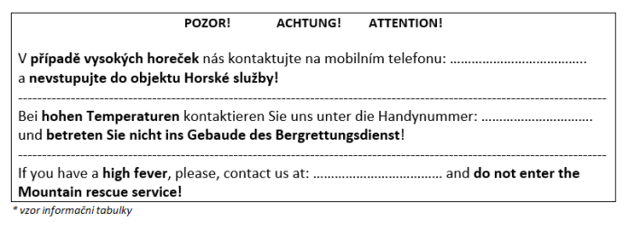 S ohledem na události minulých dnů žádáme návštěvníky a obyvatele hor, kteří mají vysoké horečky nebo mají podezření na nákazu COVID - 19, aby vyhledali níže uvedené tabulky.