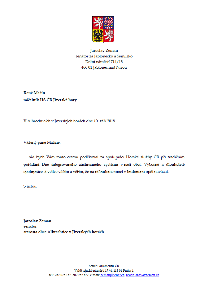 rád bych Vám touto cestou poděkoval za spolupráci Horské služby ČR při tradičním pořádání Dne integrovaného záchranného systému v naší obci. Výborné a dlouholeté spolupráce si velice vážím a věřím, že na ní budeme moci v budoucnu opět navázat.