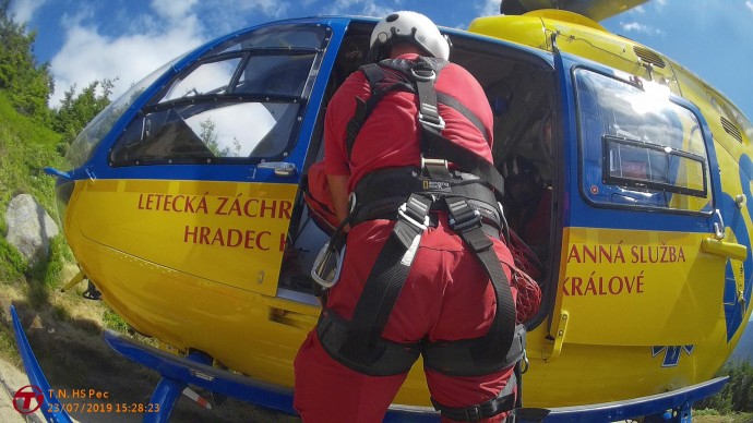 Další turisté, kteří byli svědky nehody, ihned použili aplikaci Záchranka. „Dispečerům Zdravotnické záchranné služby se podařilo od nich zjistit potřebné informace. Vzhledem k udané zdravotní minulosti poraněného muže došel dispečink k závěru, že je nutné zvolit zásah za pomocí vrtulníku. Ten přistál v Peci pod Sněžkou, kde na palubu přistoupil záchranář HS,“ uvedl k záchranné akci Tomáš Novák, zasahující člen Horské služby Krkonoše.