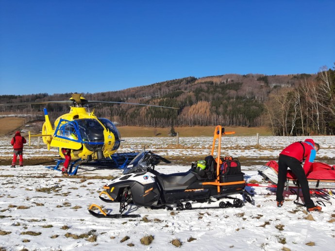 Jizerské hory, 14. února 2022 – Patnáctiletého chlapce po úrazu na sněžném skútru a seniora z Německa, který přečkal noc v závěji, včera a dnes zachraňovali členové HS Jizerské hory.