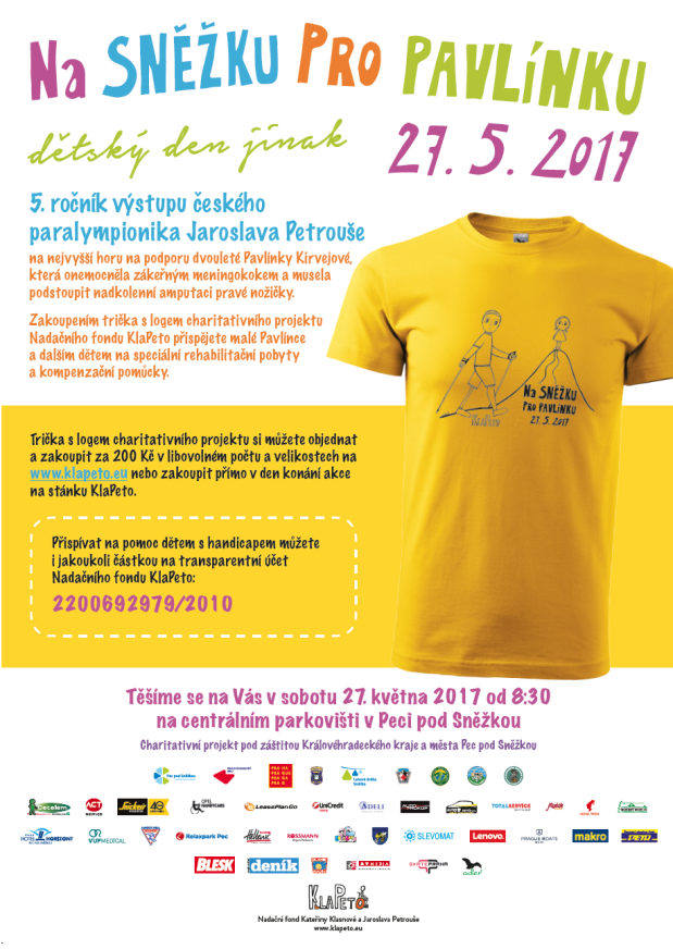 Letošní výstup nese název "Na Sněžku pro Pavlínku", který je věnovaný dvouleté holčičce, která prodělala meningokovou sepsi a musela ji být amputovaná nožička. Jako podpora celé akce slouží benefiční trička, která se prodávají za částku 200,- Kč a celý jejich výtěžek jde na podporu handicapovaných dětí.