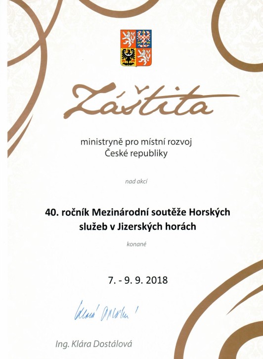 Záštitu nad 40. ročníkem Mezinárodní letní soutěže Horských služeb udělila ministryně pro místní rozvoj, Ing. Klára Dostálová