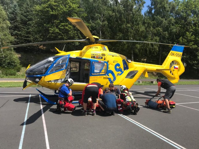 Současně byl na místo vyslán vrtulník letecké záchranné služby (LZS) z Ústí nad Labem. Z důvodu nepřístupného terénu musel z paluby vrtulníku slanit k místě zásahu záchranář a lékař LZS. Po ošetření raněného byl muž transportován na heliport u stanice Horské služby, kde došlo k přeložení pacienta do vrtulníku, a dále byl vrtulníkem přepraven do nemocnice v Ústí nad Labem.