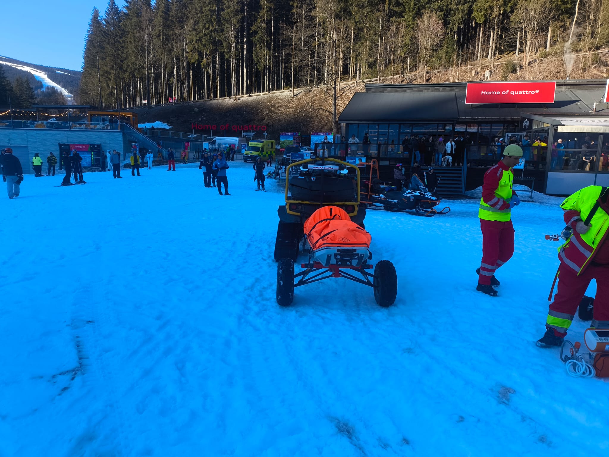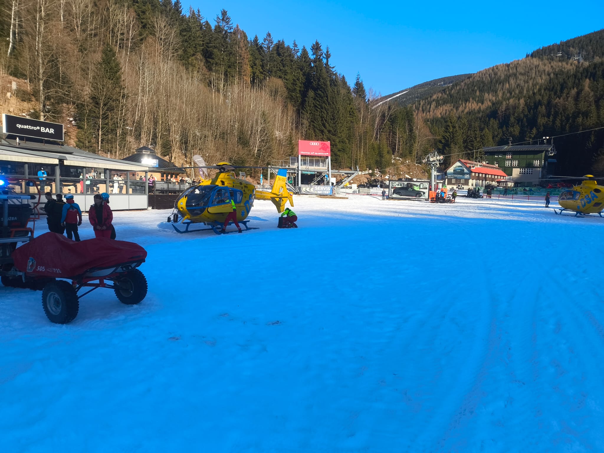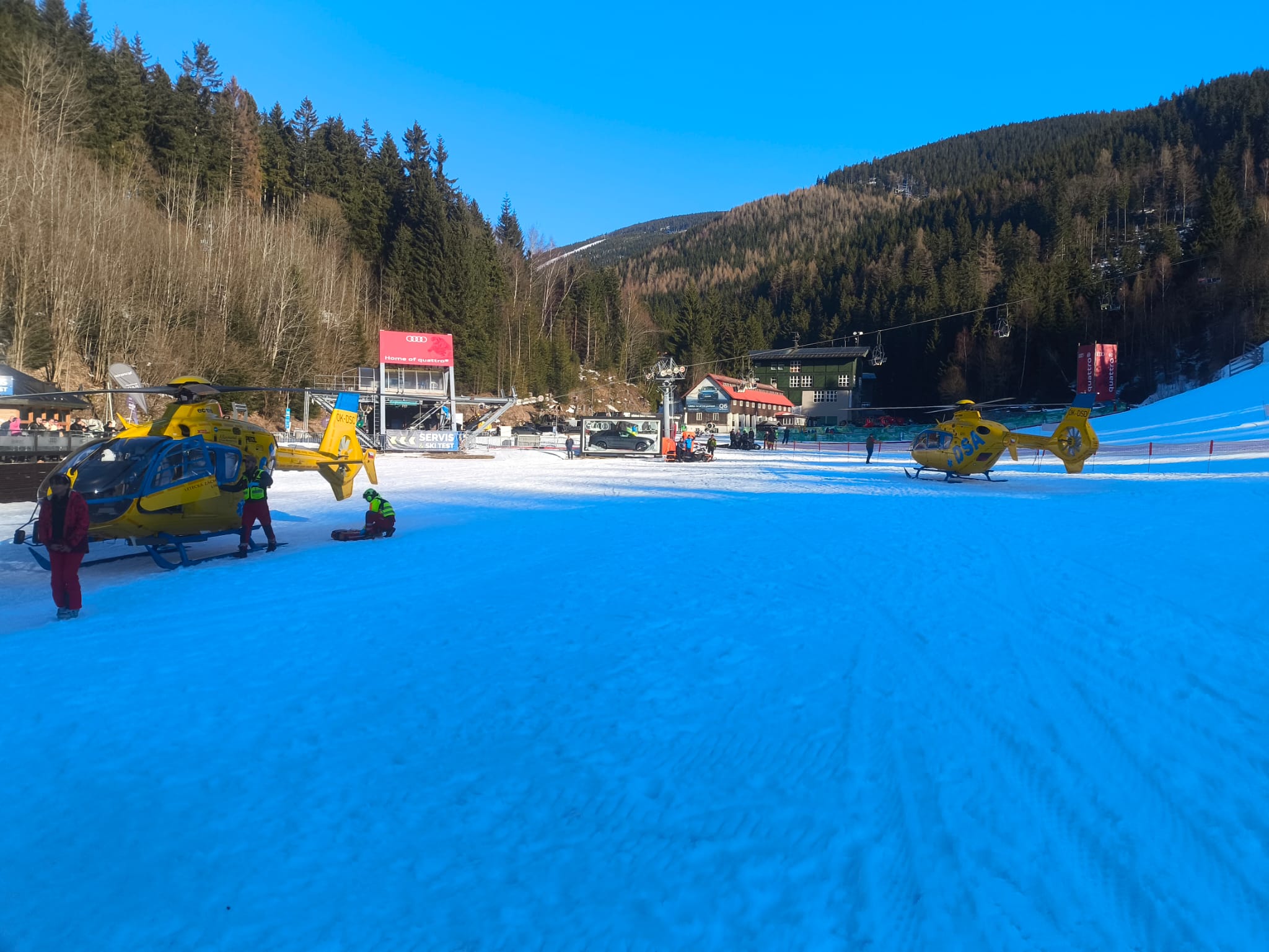 Zatím co naši záchranáři, ve spolupráci s posádkou RLP z Vrchlabí, oba zraněné umístili do vakuových matrací, zabezpečili jim tepelný komfort a připravili na následný transport do zdravotnických zařízení, zaměstnanci Skiareálu se postarali o zabezpečení prostoru pro přistání dvou vrtulníků najednou, “ popsal jeden ze zasahujících špindlerovských horskoslužebníků.