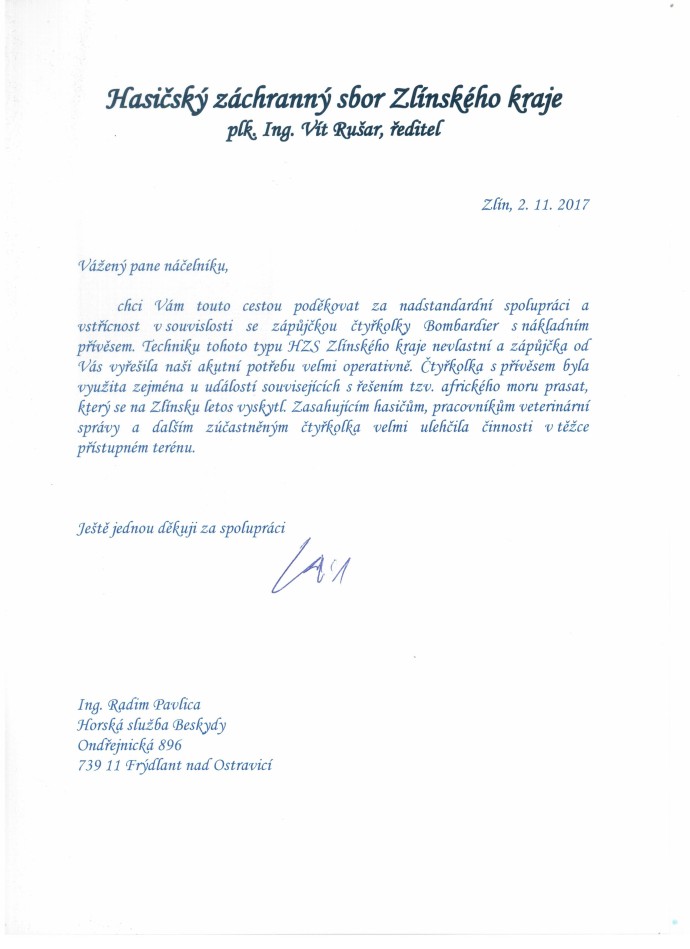 Díky naší čtyřkolce hasiči vyřešili akutní potřebu a zapůjčená technika tak ulehčila činnost HZS v těžce přístupném terénu.Nyní jsme dostali od HZS poděkování.