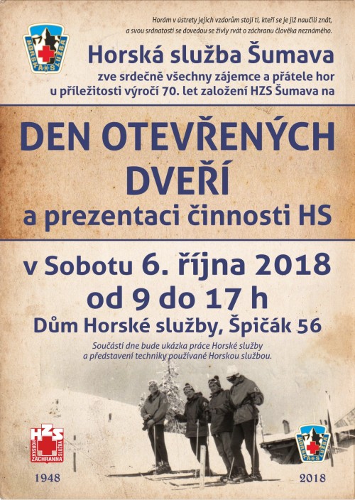 Šumava, 3. října 2018 – 70. výročí založení Horské služby v tomto pohoří oslaví v sobotu 6. 10. profesionální i dobrovolní členové Horské služby Šumava, jsou zváni i návštěvníci z řad turistů, lyžařů a přátel Šumavy.