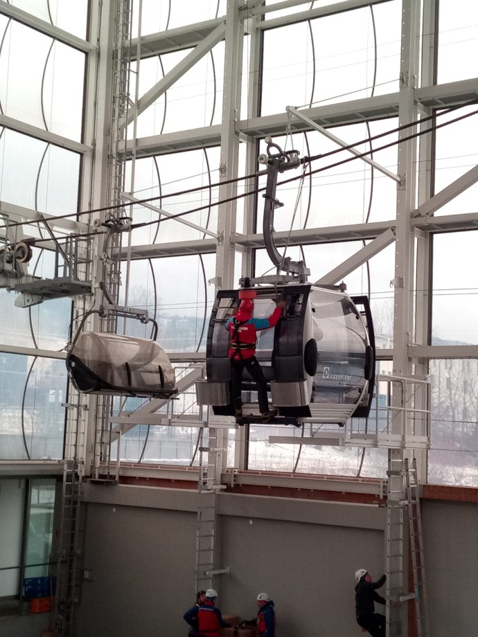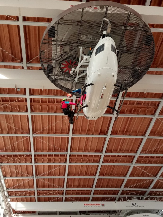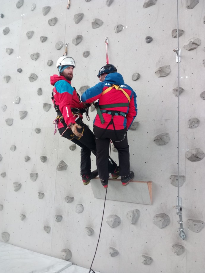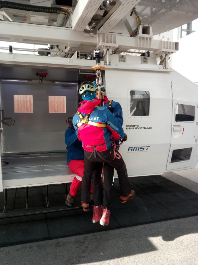 Celkem deset členů HS, z nichž psovod a jeden služební pes cvičili ve výcvikové hale, která je uzpůsobena pro trénink náročné práce alpských záchranářů. „U nás nic takového nemáme a musím říct, že hala je dokonale vybavena na cvičení práce s vrtulníkem. Jsou zde zavěšeny dva jako simulátory a k tomu i lezecká stěna s různě obtížnými povrchy,“ komentoval prostředí náčelník Horské služby Šumava Michal Janďura.