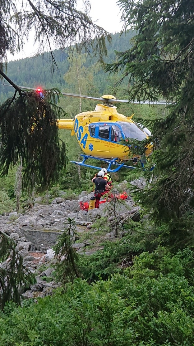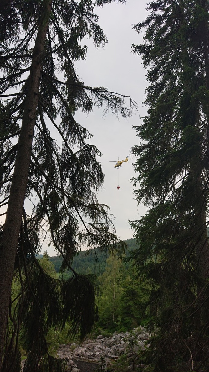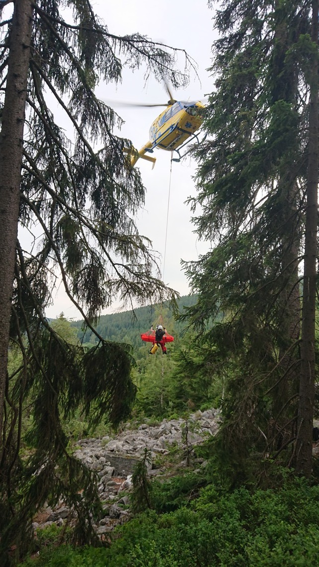 Krkonoše, 20. června 2019 – Horolezec včera v podvečer spadl z výšky cca 10 metrů na Hnědých skalách u Strážného, musel pro něj letět vrtulník.