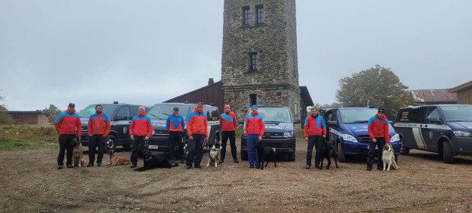 Praha, Špindlerův Mlýn, 12. října 2021 – Devět psovodů se svými skvěle vycvičenými pátracími psy a dva specialisté s drony pátrali za Horskou službu ČR po ztracené osmileté holčičce v okolí vrchu Čerchov.