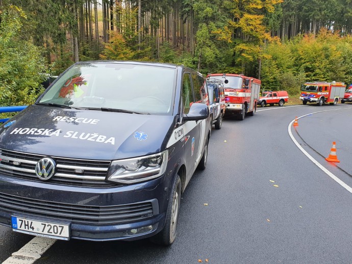 Jeseníky, 15. října 2021 – Tento výkon služebního pátracího psa z jesenické Horské služby mohli vidět účastníci cvičení složek Integrovaného záchranného systému dnes dopoledne ve Filipovicích pod Červenohorským sedlem.