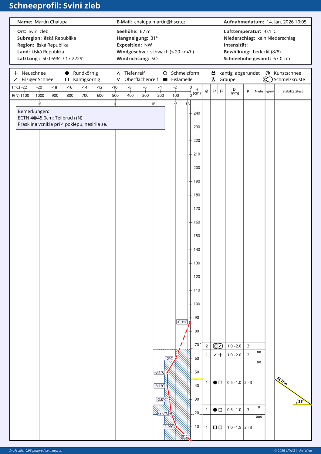 Střídáním záporných a kladných teplot se základní sněhová vrstva stabilizovala a na povrchu se vytvořila firnová krusta, na kterou napadl a vítr navál nový sníh.