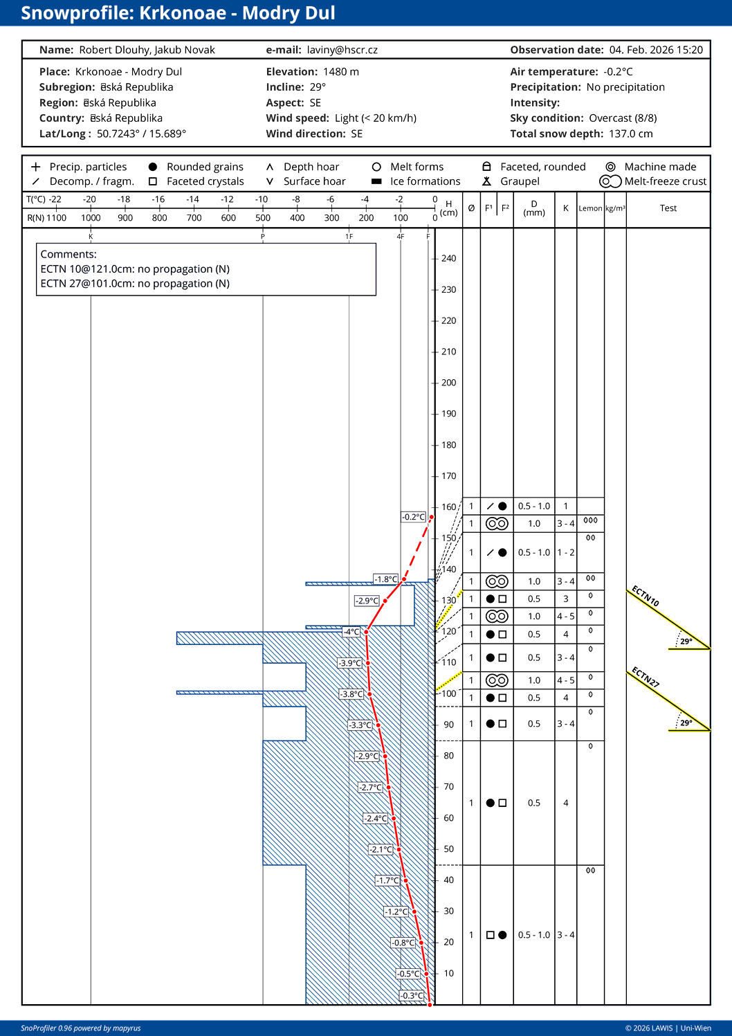 Na hřebenech Krkonoš je cca 45 - 55 cm sněhu. Na ledovou krustu napadlo za poslední sněžení cca 20 cm nového sněhu. Sníh padal za působení silného zpočátku JZ později SZ větru. Na závětrných svazích a žlabech je ho uloženo větší množství. V současné době jsou teploty nad 0°C i na hřebenech hor. Po oteplení a dešti je sněhová pokrývka mokrá až podmáčená. Zde se mohou vyskytnout laviny z mokrého sněhu a laviny klouzavé. Uvolnění laviny je možné hlavně při velkém dodatečném zatížení a to zejména na strmých svazích. Možnost samovolného uvolnění velmi velkých lavin se nepředpokládá. Dají se očekávat laviny menších a ojediněle středních rozměrů, které se většinou zastaví ještě na svahu.