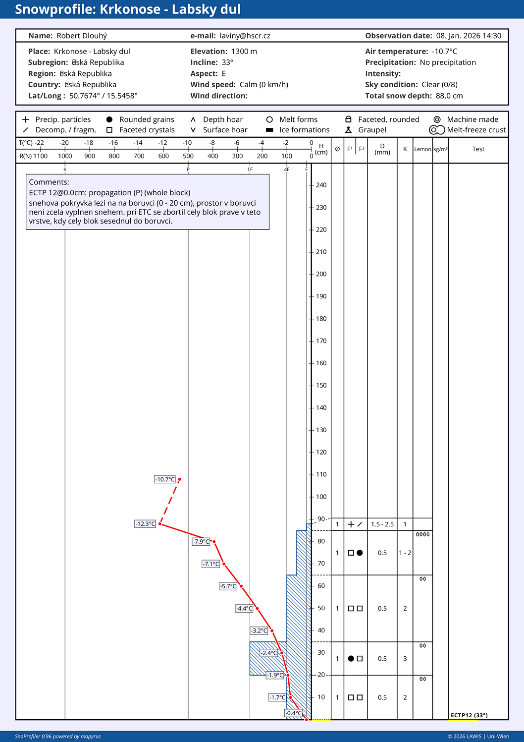 Na hřebenech Krkonoš je 25 - 45 cm sněhu. Za poslední sněžení napadlo 20 cm nového sněhu za působení J až JV větru. Vlivem větru je více sněhu uloženo na závětrných svazích (SZ až SV) a ve žlabech. Na severních svazích sníh napadl na několika centimetrovou vrstvu hranatého sněhu (po prvním sněžení). Na závětrných svazích a žlabech se mohou vyskytnout malé laviny z navátého sněhu, které se zastaví ještě na svahu.
