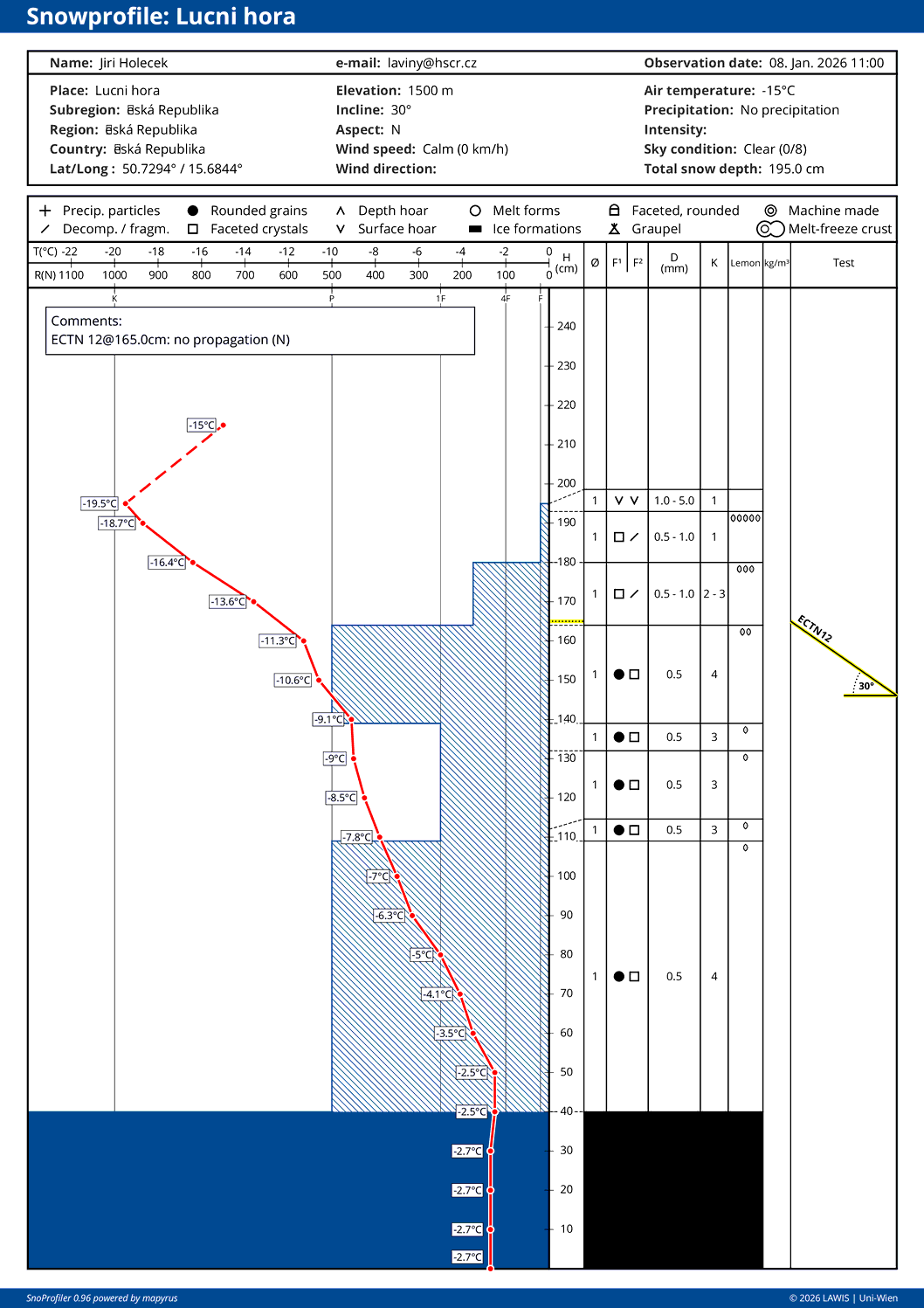 | Sníh: | Celkem: 35 cm, Nový: 0 cm, Kvalita: nový sníh - suchý |