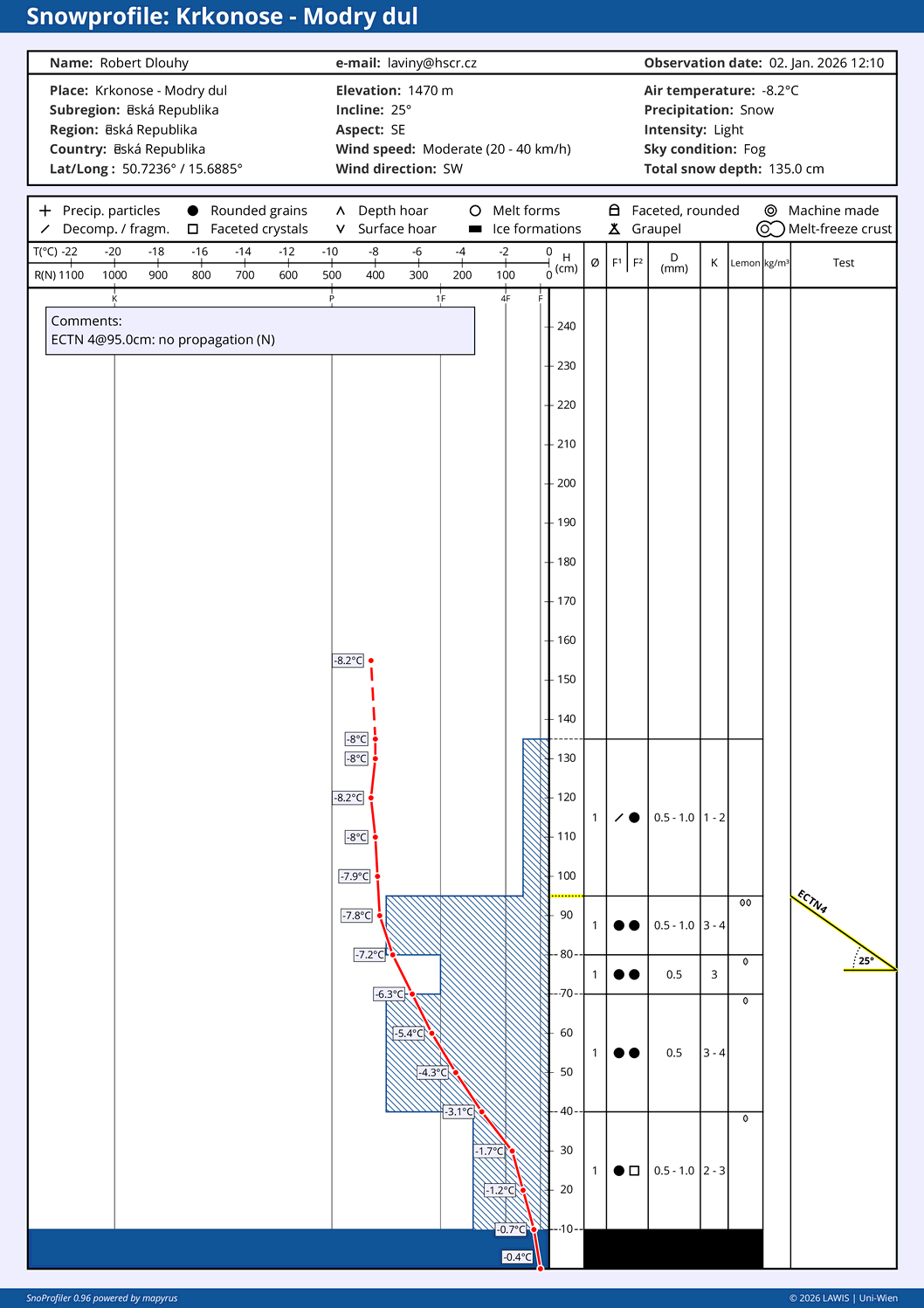 V dopoledních hodinách je sněhová pokrývka ztuhlá až zmrzlá. V odpoledních hodinách, se zvyšující se teplotou, riziko pádu lavin stoupá. Mohou se vyskytnout laviny z mokrého sněhu a to především na jižně orientovaných a slunných svazích.