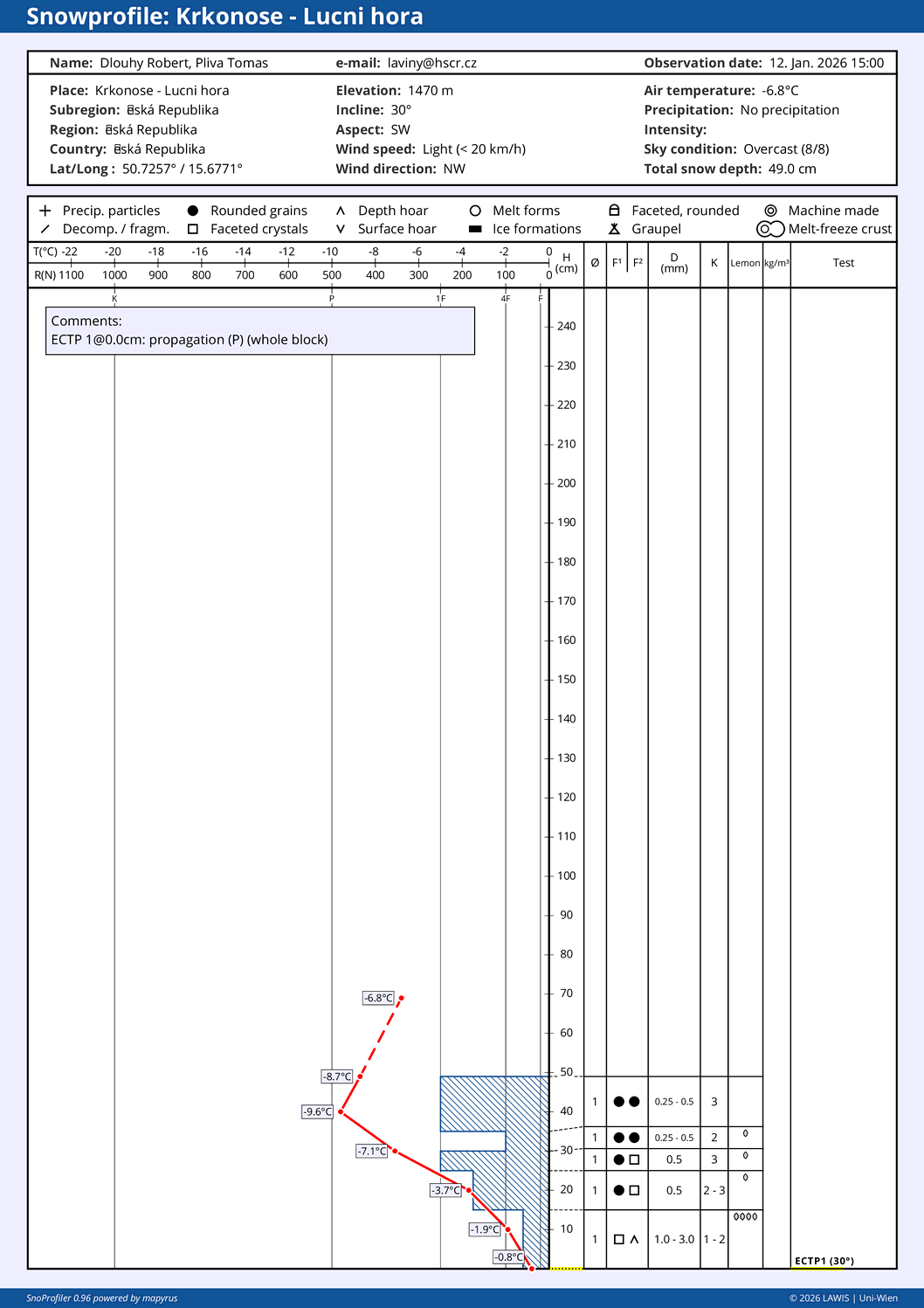 | Sníh: | Celkem: 20 cm, Nový: 5 cm, Kvalita: nový sníh - suchý |
